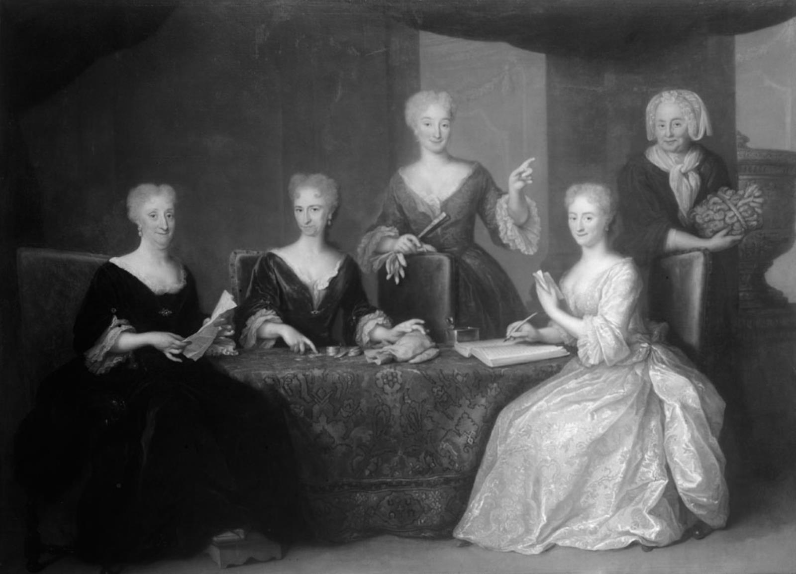 Op het schilderij zie je Aletta Maria van Streyen, Catherina Clara Geelvinck, Machtelina Christina Lestevenon, Geertruid van der Lyn en Catrina Rijkers. Bron: Amsterdam museum
