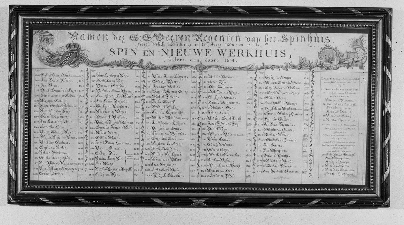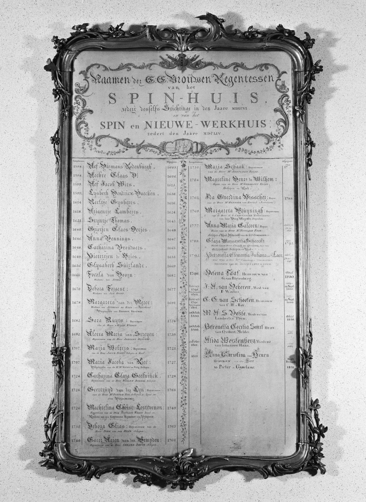 Zwart-wit foto van de namenlijst van regentessen van het Spin- en Werkhuis, gemaakt tussen 1725 – 1775.