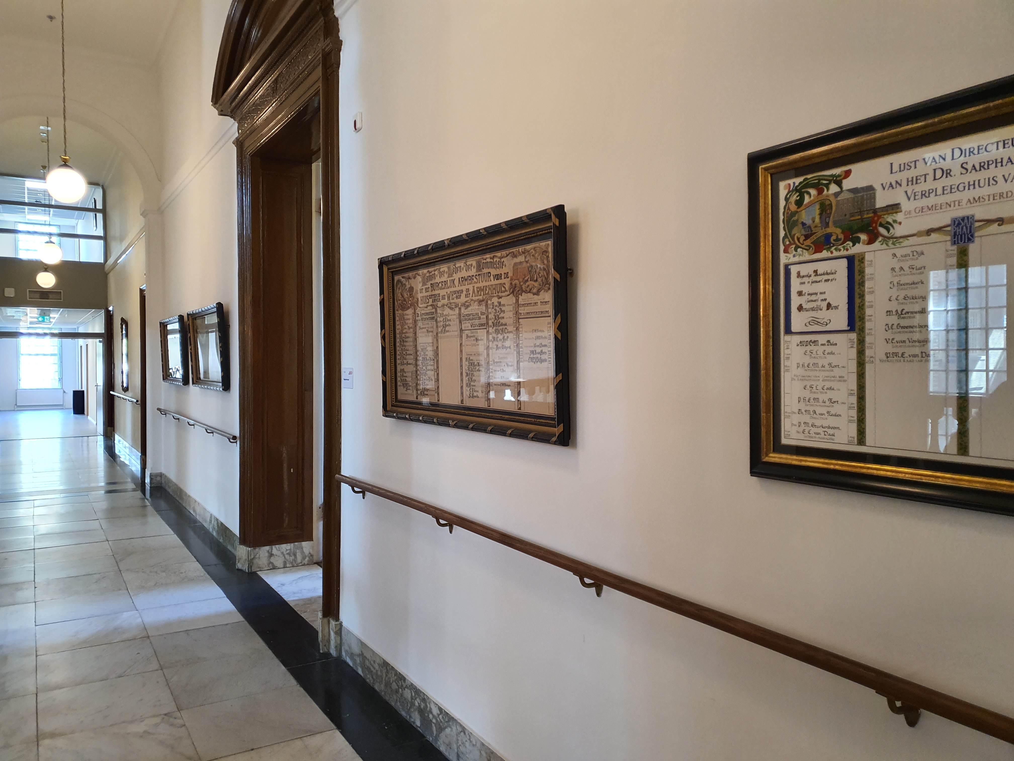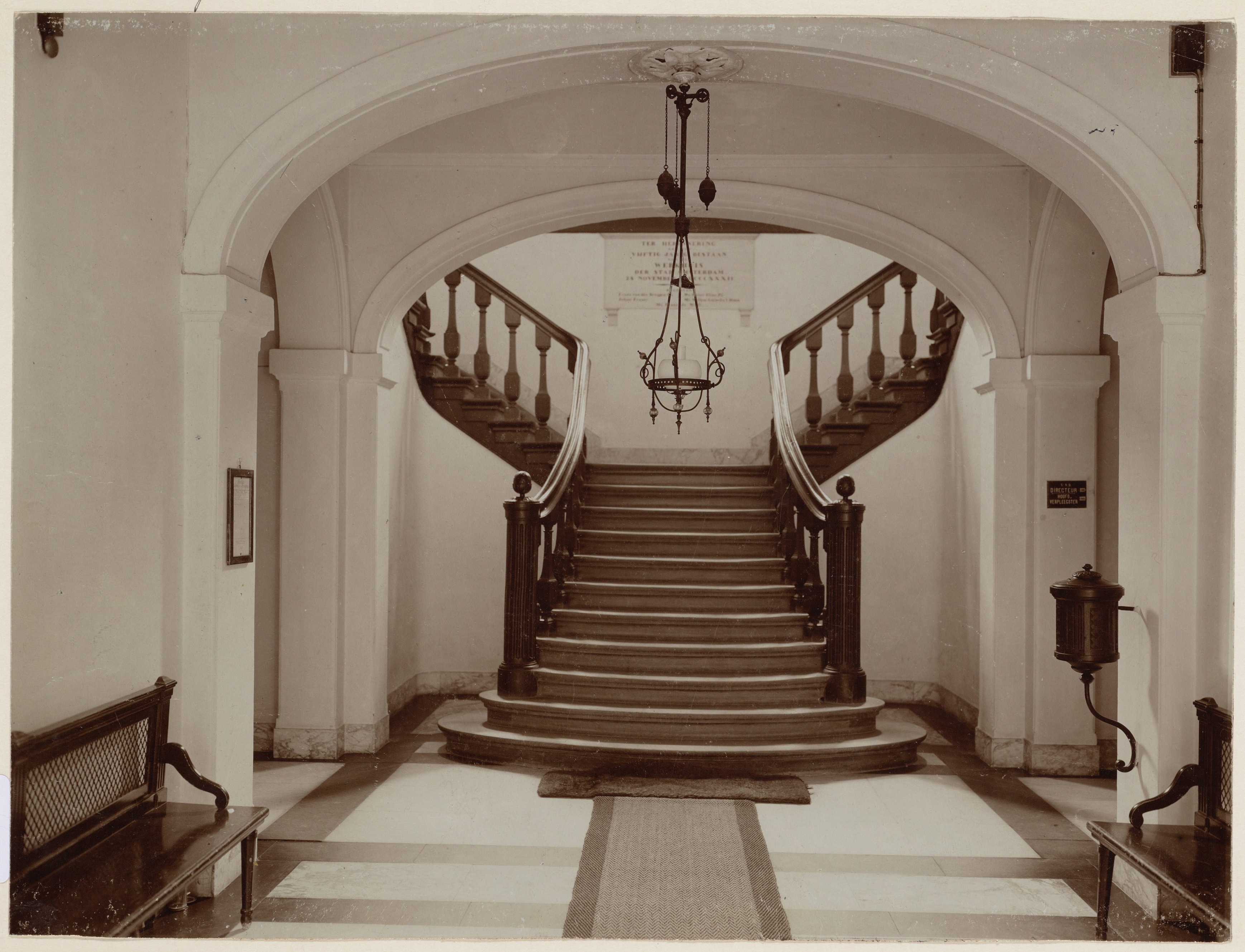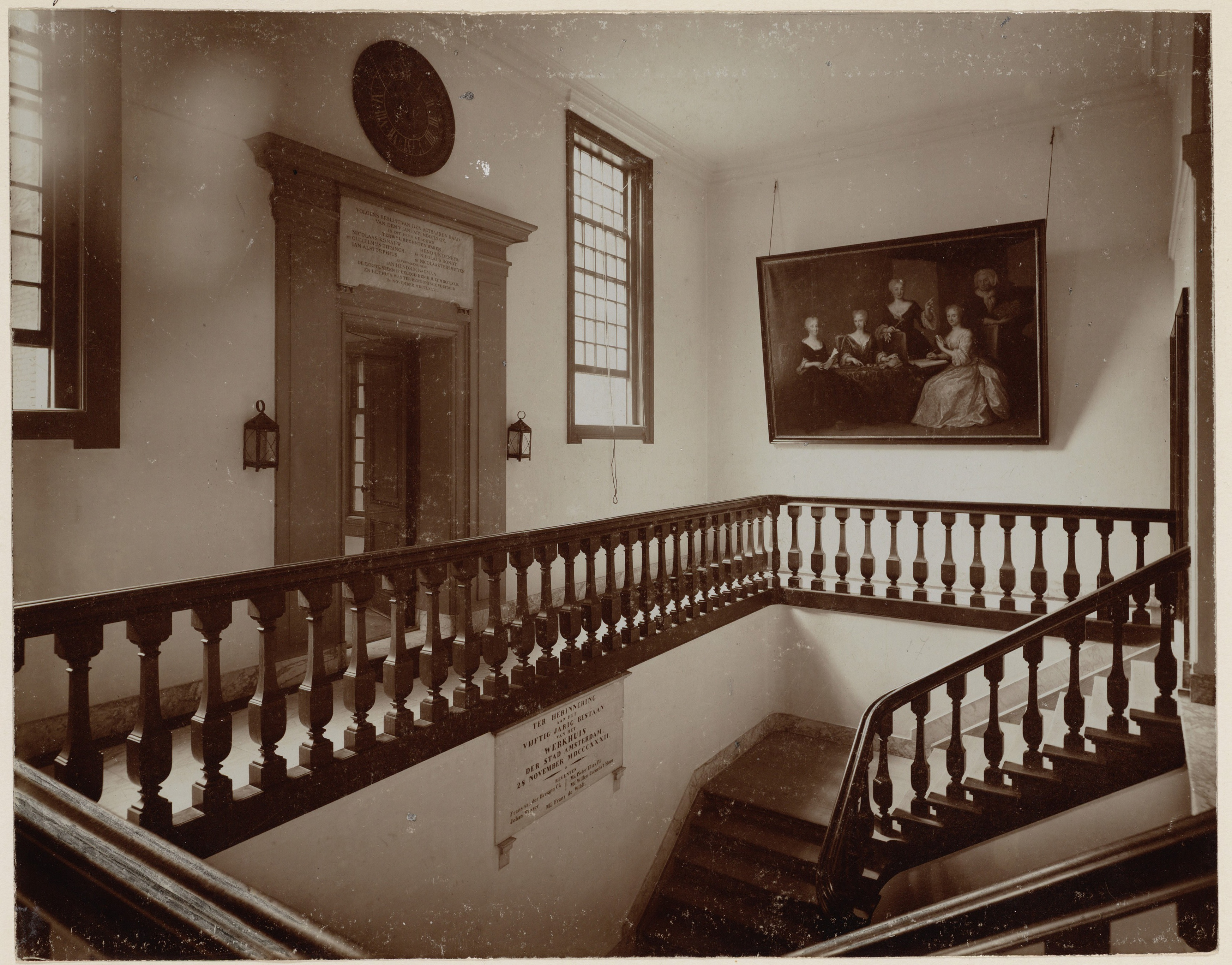 Het schilderij met de regentessen hangt al heel lang bij de trap van het nieuwe werkhuis (nu het dr. Sarphatihuis). Deze foto is gemaakt rond 1900. Links van de trap zie je ook de ingang naar de brug over de muur. Bron: Stadsarchief Amsterdam