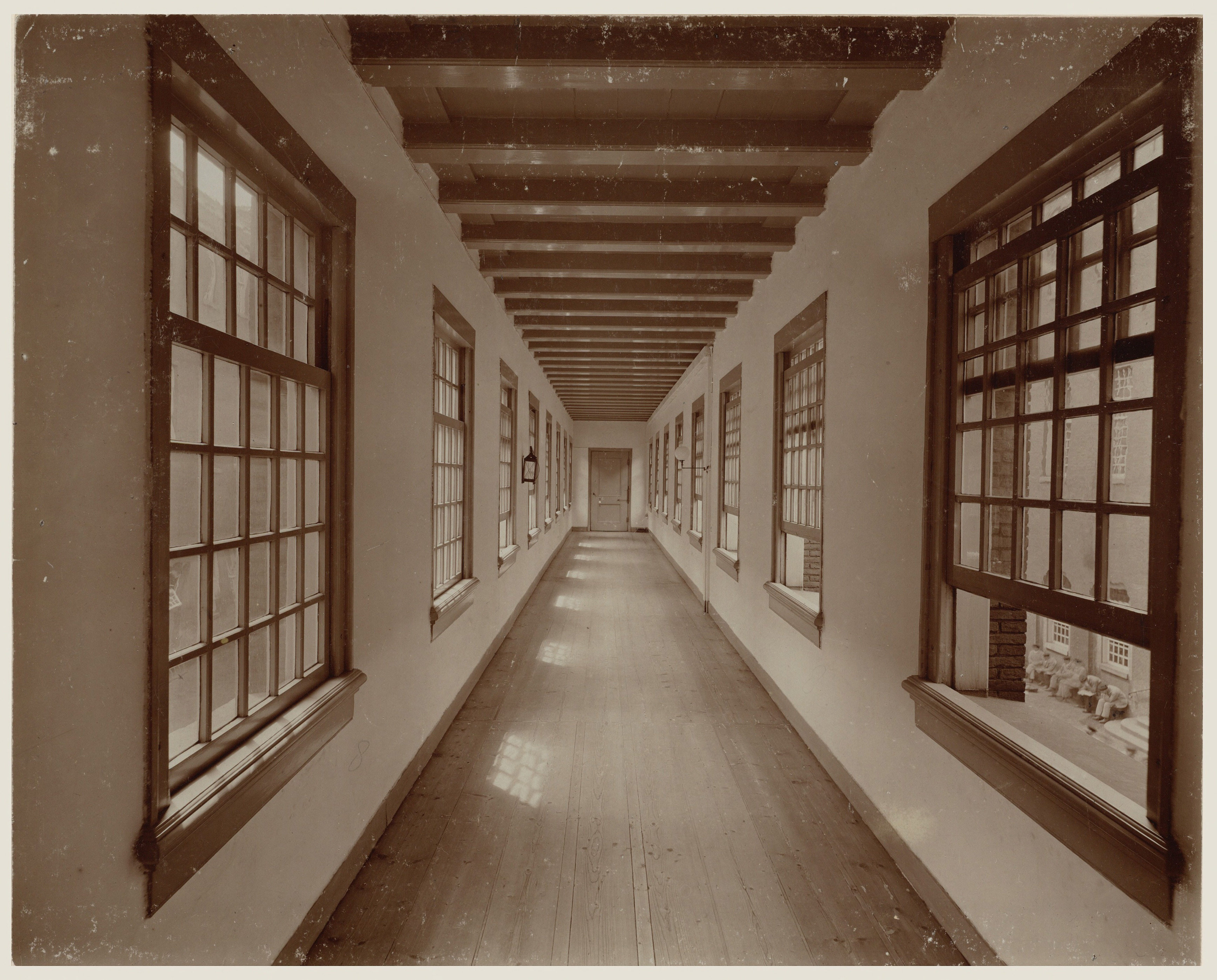 Vroeger liep er door het gebouw een dikke muur, over deze muur kon je lopen. De muur verbond de werkplekken van de regentessen en regenten met die van de binnenmoeder en -vader. Via deze brug kon er goed overzicht gehouden worden over de bewoners. Bron: Stadsarchief Amsterdam
