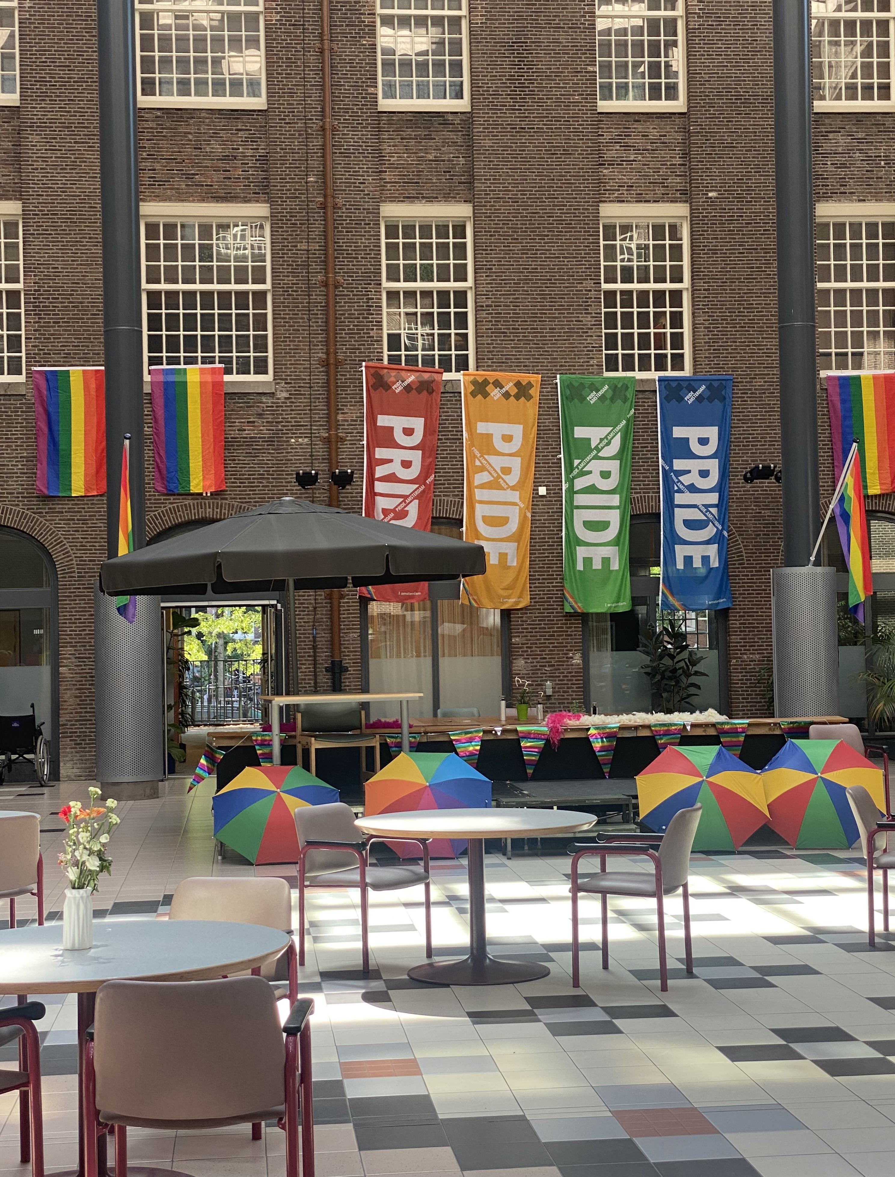 De gang bij de vergaderzalen wordt verlicht met mooie regenboogkleuren. Het Dr. Sarphatihuis heeft ook een roze afdeling: Rozeneiland.