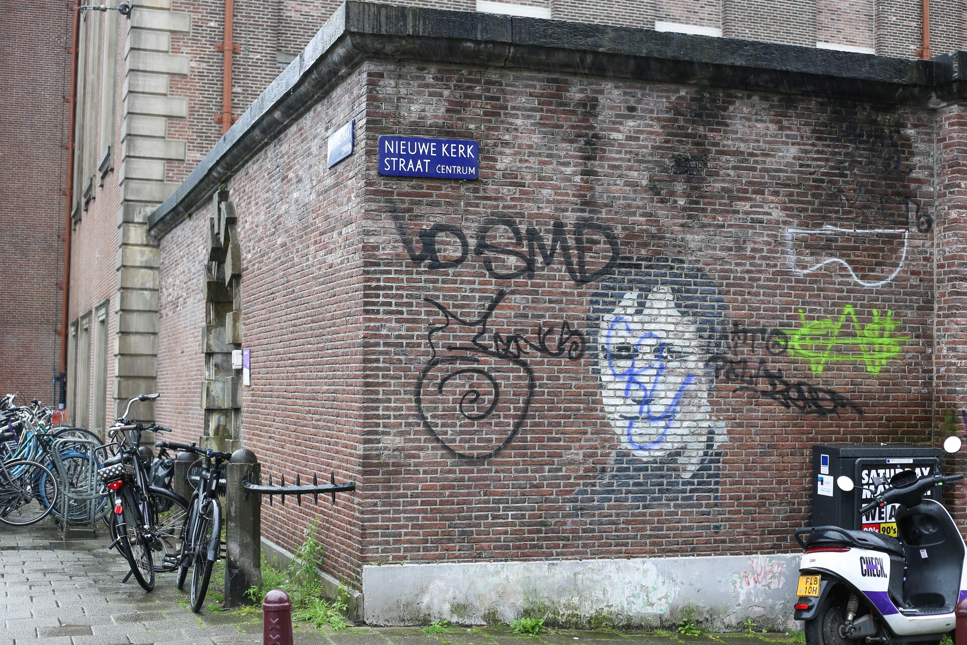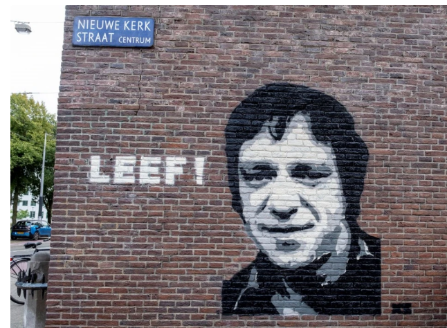 De muurschildering van Ramses Shaffy, op de hoek van het Dr. Sarphatihuis, is hersteld. Femke Halsema: “Wat de schildering helemaal compleet maakt is dat de kunstenaar in één woord heeft weten samen te vatten wat niet alleen Shaffy’s eigen leidraad was maar ook een motto is dat perfect bij onze stad past: “LEEF!”
