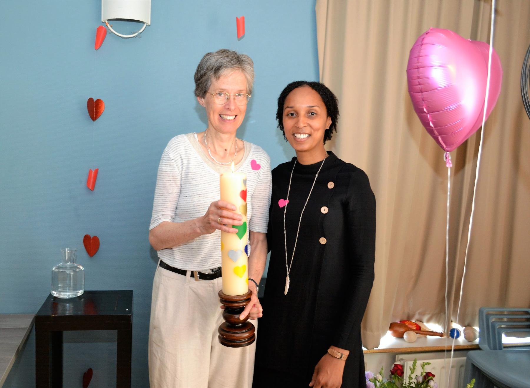 Hij was 25 jaar geleden een van de eerste bewoners: ‘Ik wilde gewoon iedereen weer eens zien en vind het leuk om een feestje te organiseren.’ Een van de medewerkers die Michael daarbij hielp is Elske Cazemier, geestelijk verzorgster en al sinds 2001 met veel plezier betrokken bij de Kleine Johannes en Amsta Karaad. ‘Bewoners en begeleiders hebben elkaar hier echt iets te bieden en zo ontstaat vaak een heel bijzondere band’, vertelt Elske. De viering vandaag is feestelijk, maar toch wordt ook even stilgestaan bij bewoners of medewerkers die er niet meer zijn. Michael: ‘Zij horen er natuurlijk ook gewoon bij.’