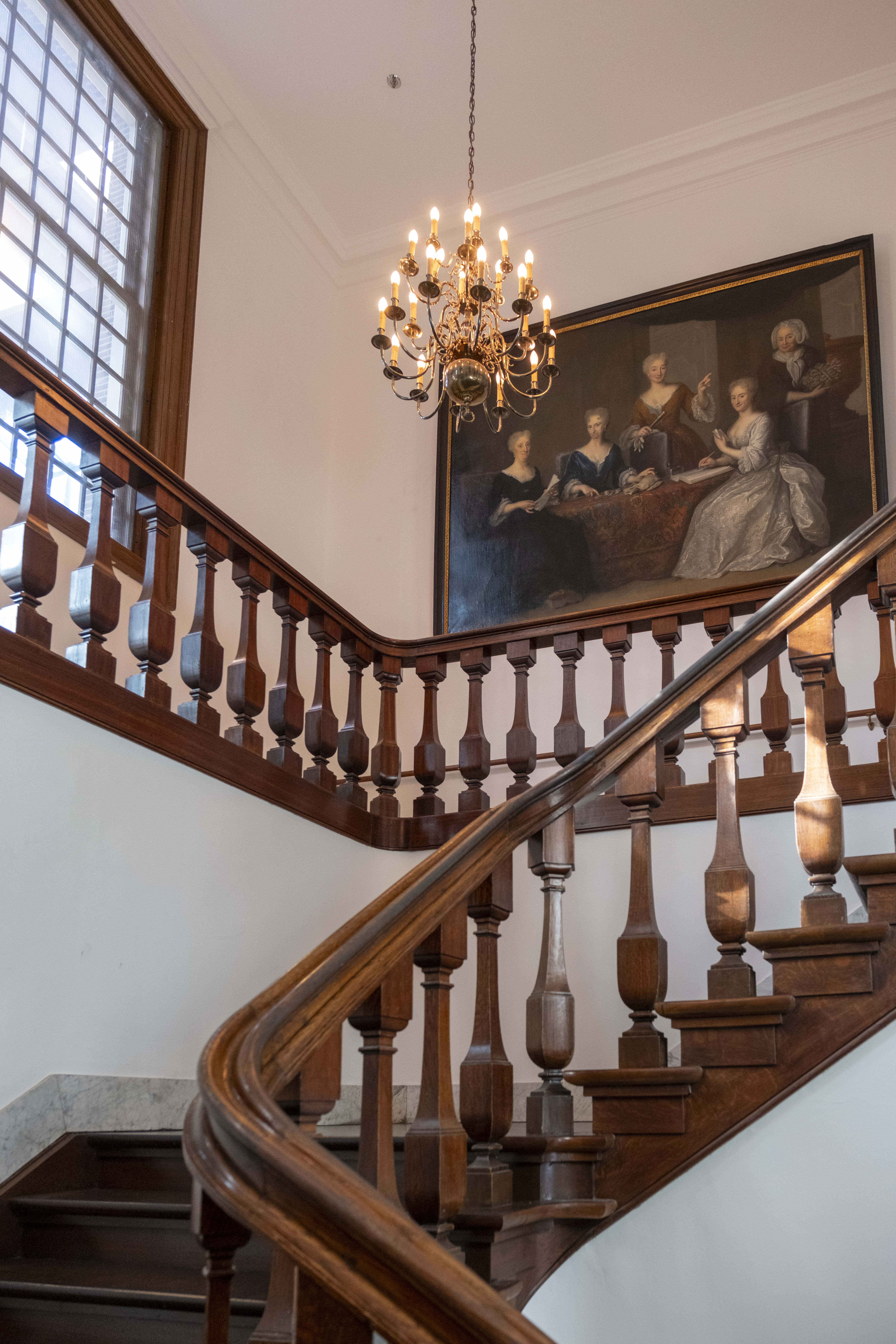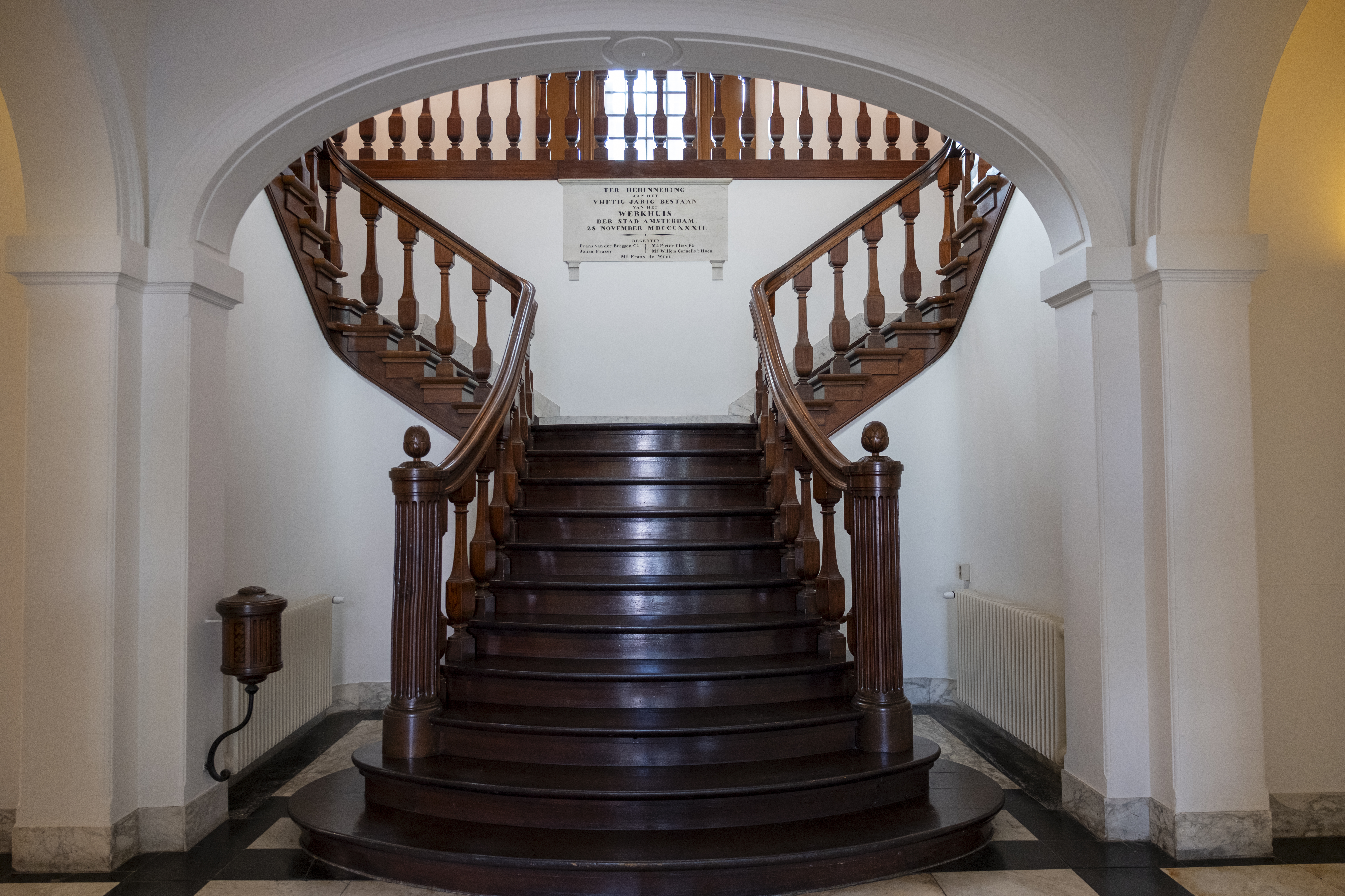 De bekende trap bij de ingang van het pand. Deze werd vroeger alleen gebruikt door regenten en regentessen. Via deze trap kom je bij de drie grote vergaderzalen: De Muidergrachtkamer, De Prinsengrachtkamer en De Regentenzaal.