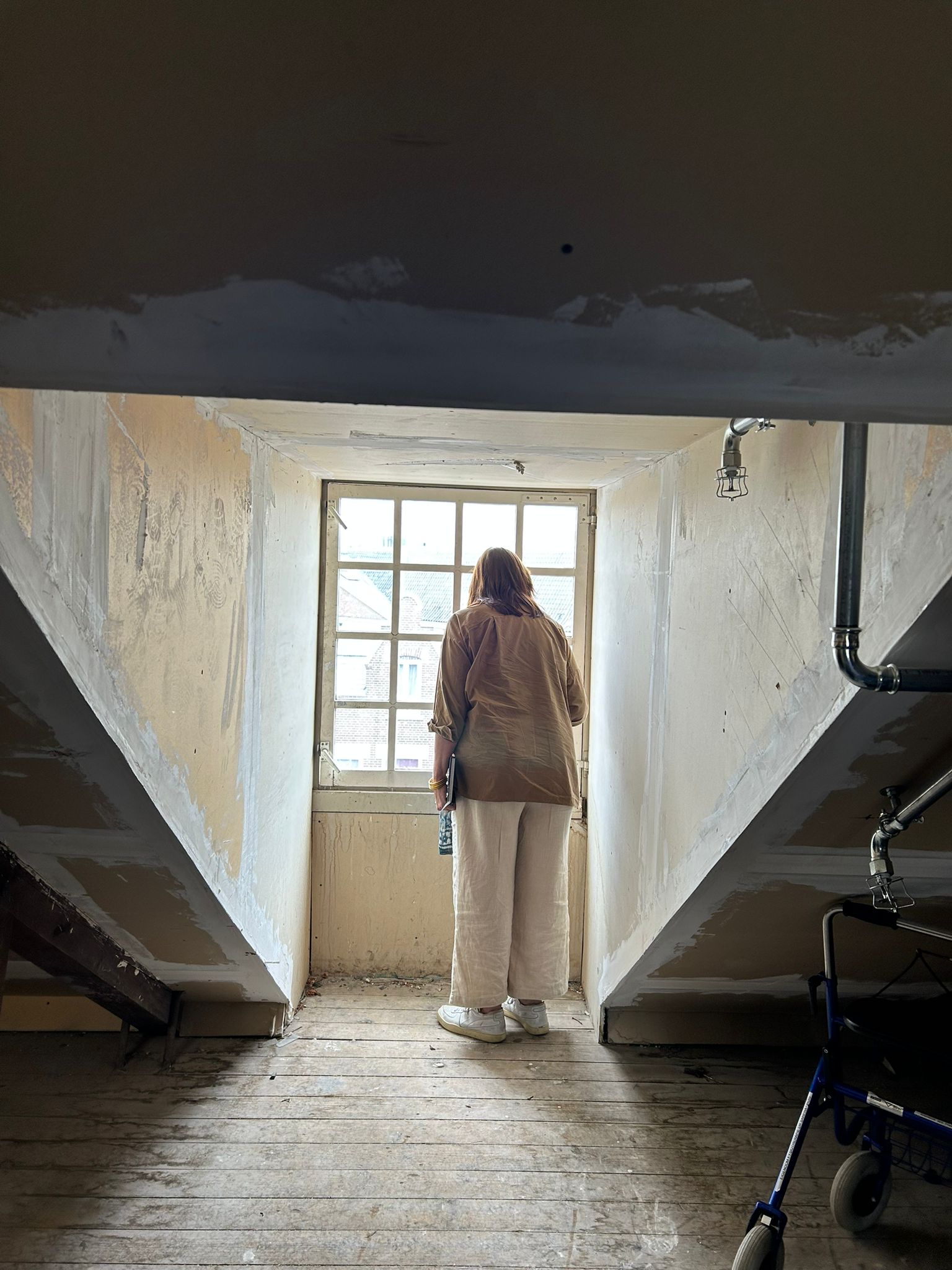 Anouk kijkt door één van de ramen op zolder, deze is opgeruimd en netjes. We vinden er dus niet veel.