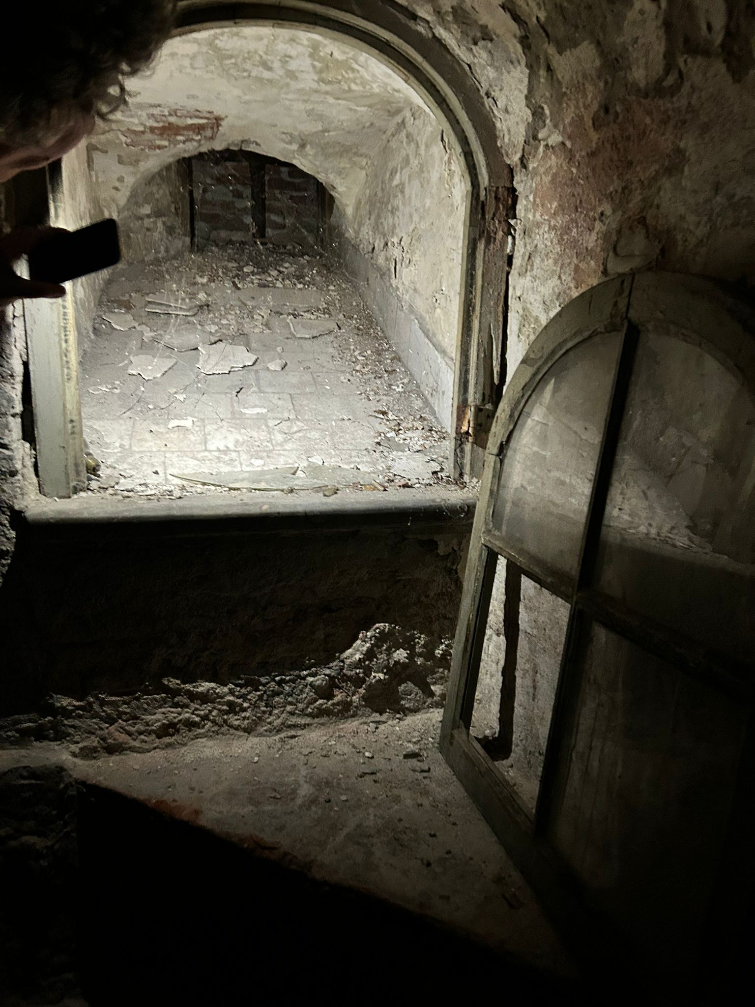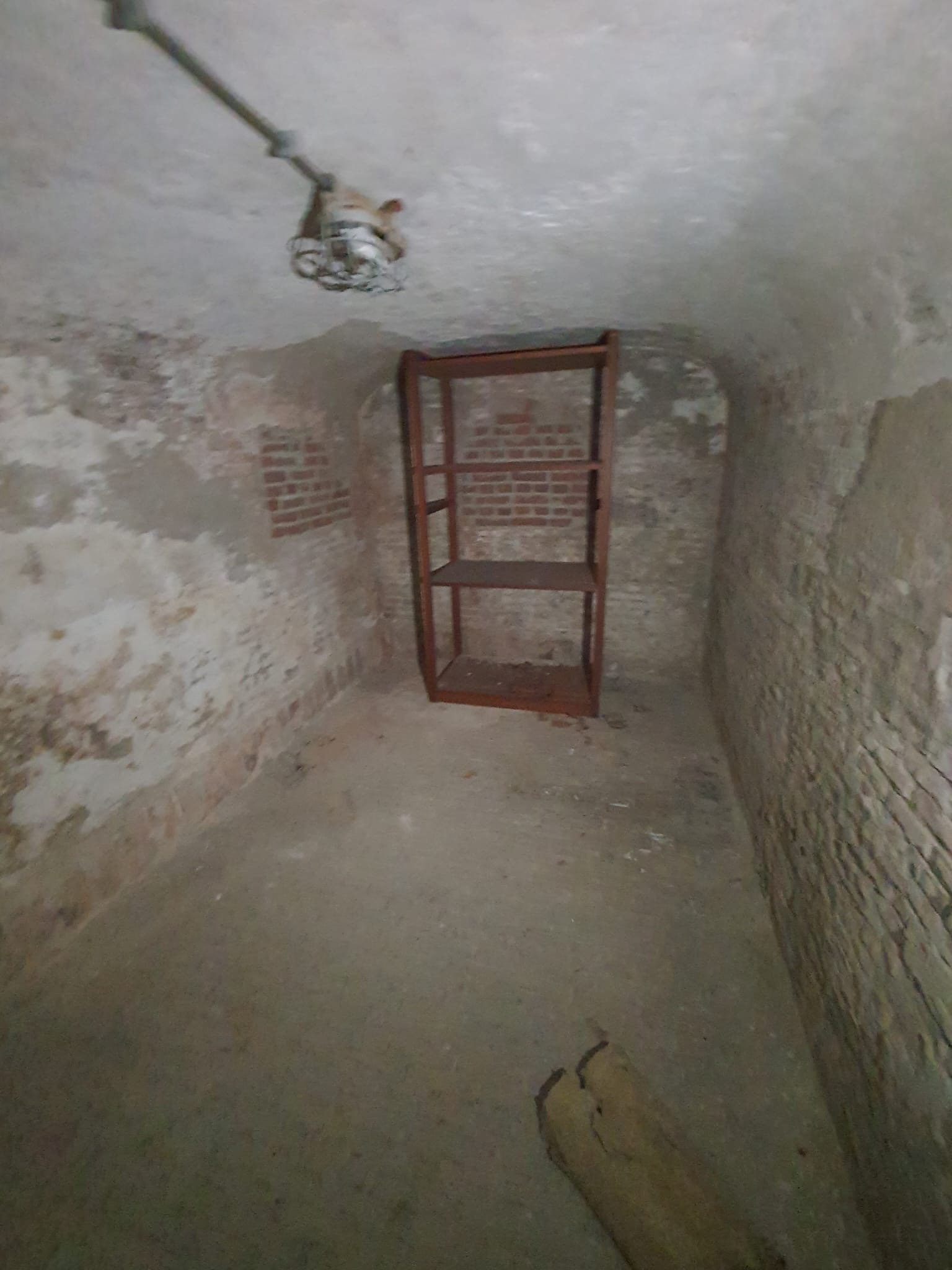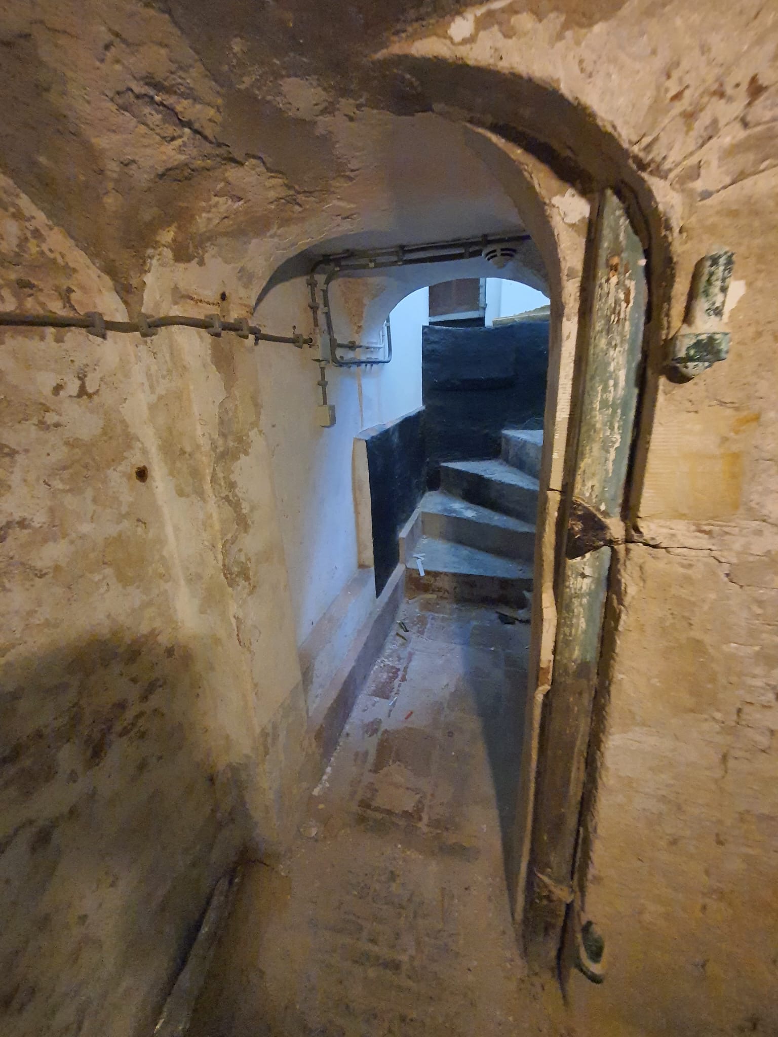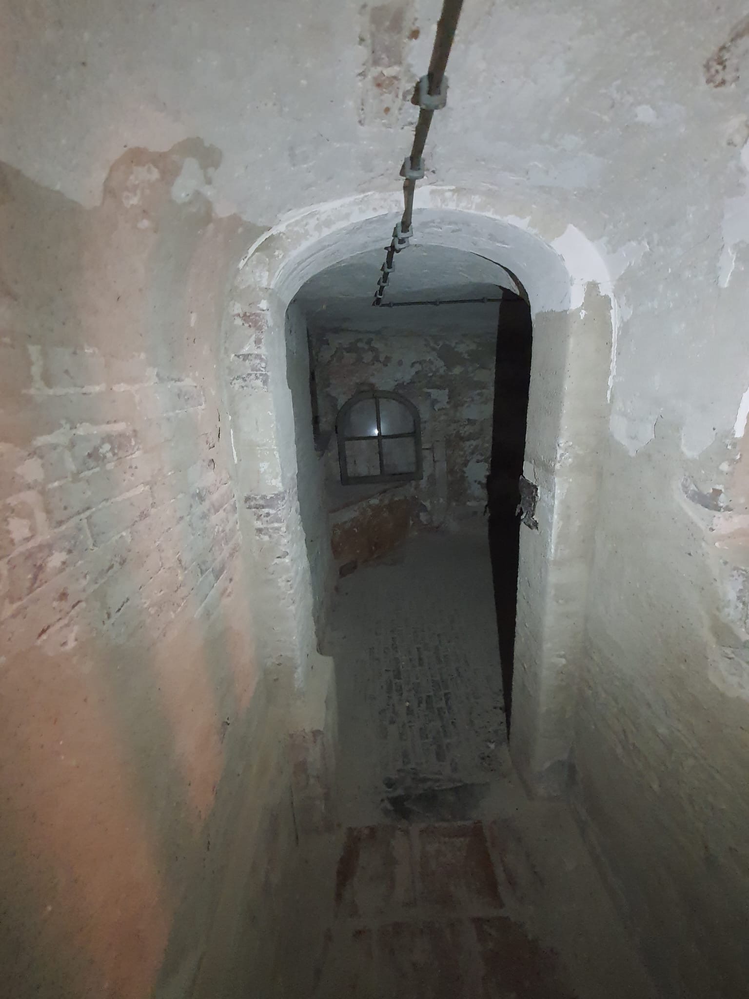 De gang naar één van de twee cellen. Je ziet nog het slot zitten van de deur. Links achterin zit de 'glijbaan'.