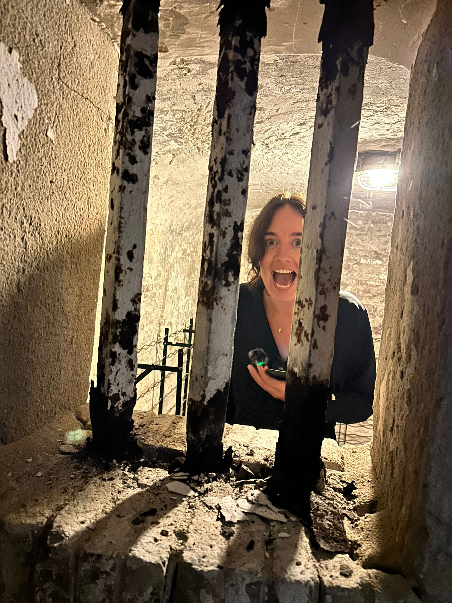 Dorien in één van de twee cellen, achter haar zie je de wijnrekken.